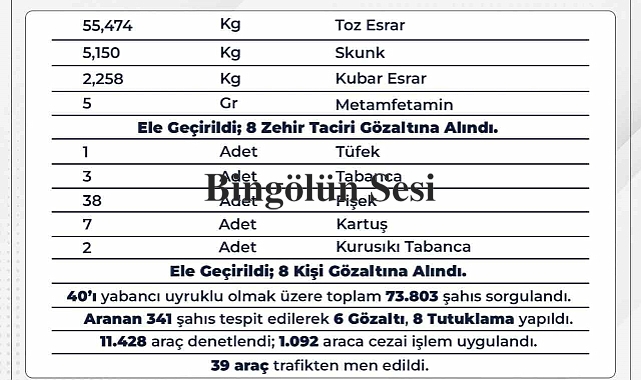 Vali Ahmet Hamdi Usta, İl Emniyet Müdürlüğü ve İl Jandarma Komutanlığı ekiplerinin 26 Şubat-4 Mart tarihleri arasında yaptığı çalışmaları açıkladı. Sosyal medya hesabından açıklamalarda bulunan Vali Usta, güvenlik güçlerinin 55 kilo toz esrar, 5 kilo skunk, 2 kilo esrar, 5 gram metamfetamin ele geçirdiğini ve 8 zehir tacirinin gözaltına alındığını belirtti.Vali Usta, “1 adet tüfek, 3 adet tabanca, 38 adet fişek, 7 adet kartuş, 2 adet kurusıkı tabanca ele geçirildi, 8 kişi gözaltına alındı. 40’ı yabancı uyruklu olmak üzere toplam 73 bin 803 şahıs sorgulandı. Aranan 341 şahıs tespit edilerek 6 gözaltı, 8 tutuklama yapıldı. 11 bin 428 araç denetlendi, bin 92 araca cezai işlem uygulandı. 39 araç trafikten men edildi” dedi.Bingölün Sesi