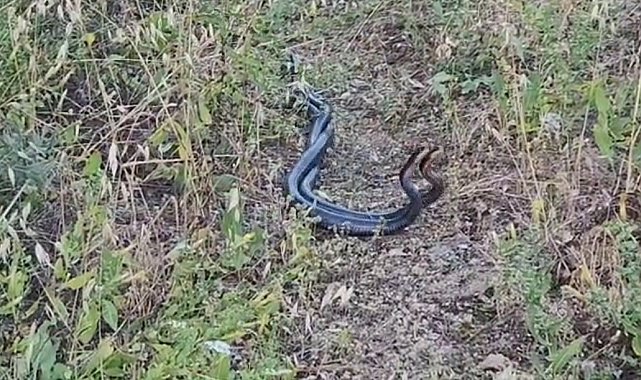 Erzincan'ın Kemaliye ilçesinde yaklaşık iki metre uzunluğundaki iki yılanın çiftleşme dansı kaydedildi.Sıcak havalarla birlikte yılanların da sık görüldüğü Kemaliye'de hemen her gün yeni görüntüler ortaya çıkıyor. Yaklaşık 2 metre uzunluğundaki iki yılanın çiftleşme dansını gören bir kişi telefonuna sarılıp o anları kaydetti. Yılanlar bir süre sonra gözden kayboldu.