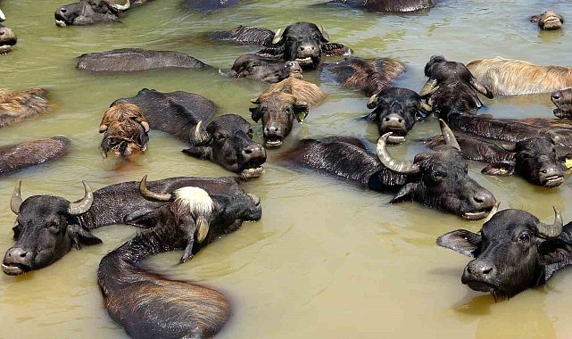 Erzincan'da son günlerde yaşanan bunaltıcı sıcaklar nedeniyle hayvancılık yapan vatandaşlar, büyükbaş hayvanlarını Karasu Nehri'nde serinletiyor.Erzincan'da vatandaşların geçim kaynağı olan mandalar, aşırı sıcakların hakim olduğu kentte günün 2-3 saatini nehrin kıyısında serinleyerek geçiriyor. Üzümlü ilçesinde bulunan mandalar, Karasu Nehri'ne sokularak serinletiliyor.Besicilik yaparak geçimlerini sağladıklarını ifade eden Yakup Sevil, "Mandalarımız öğle 12.00 gibi suya giriyor, aşağı yukarı iki saat suda kalıyor. Daha sonra hayvanları otlatıp ahıra götürüyoruz. Havalar sıcak olduğu için hayvanlar bunalıyor, su olmazsa dayanamıyorlar. Onun için bol bol suyla bunları yıkayıp, dinlendirip ahırlara yerleştiriyoruz." dedi.